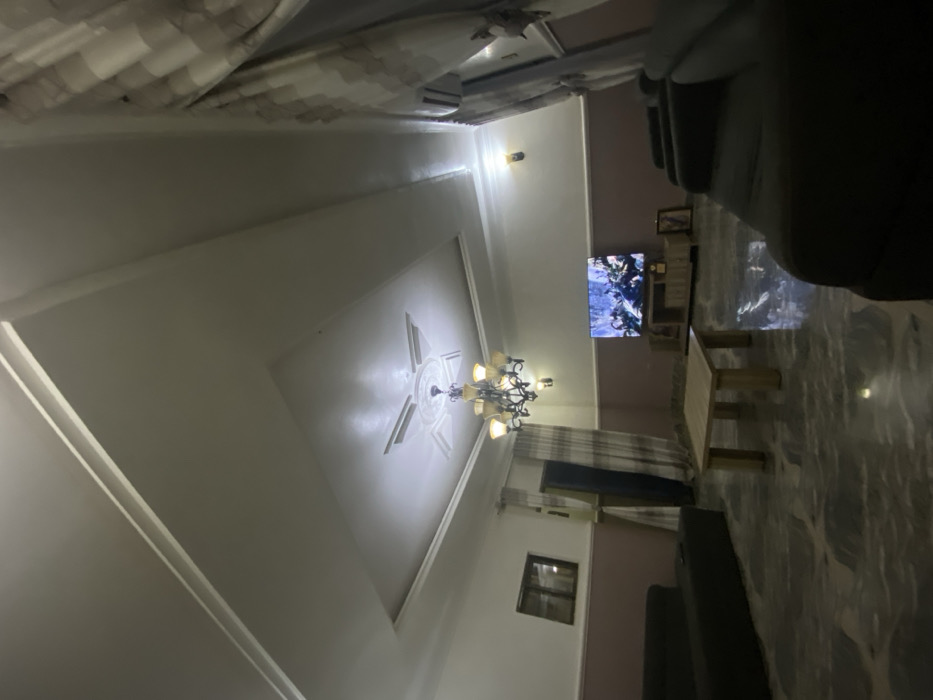 An indoor shot showcases a living room with a decorative ceiling and chandelier