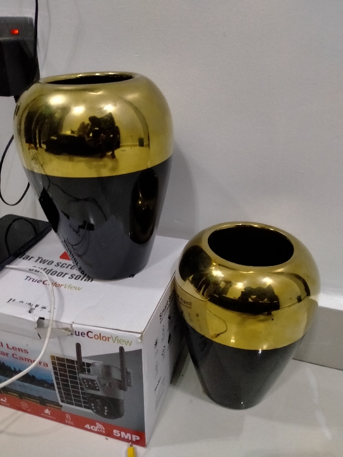 The scene depicts two decorative, bicolored containers and associated packaging in an indoor setting in Gwarinpa, Nigeria. **Objects:** * **Large Container:** Positioned on the left, a bimodal container approximately 35 cm tall. The lower section is matte black, while the upper section is reflective gold-finished metal. The top is open. Reflections on the gold surface include an indistinct human form (likely the photographer) and interior room elements. * **Small Container:** Positioned to the right and slightly in front of the large container, a similar bimodal container, approximately 18 cm tall. It features a matte black lower section and a reflective gold-finished upper section with an open top. * **Cardboard Box:** A white cardboard box supports the large container. Visible text includes "TrueColorView," "Smart Solar Two scre...", "Outdoor solar," "Full Lens," "Solar Camera," "4G LTE," and "5MP." An image of a security camera with a solar panel and dual antennae is printed on the box. * **Electronics:** A black power adapter with a red indicator light is partially visible in the upper left corner. Several black cables are present in the background. A white cable extends from the area of the box. A yellow RCA-type connector is visible at the bottom left, near the box. **Environment:** * The background consists of a plain white wall. * The objects rest on a light-colored, flat surface, consistent with a table or shelf. **People:** * No individuals are directly visible. A blurred reflection of a person is discernible on the reflective gold surface of the larger container.