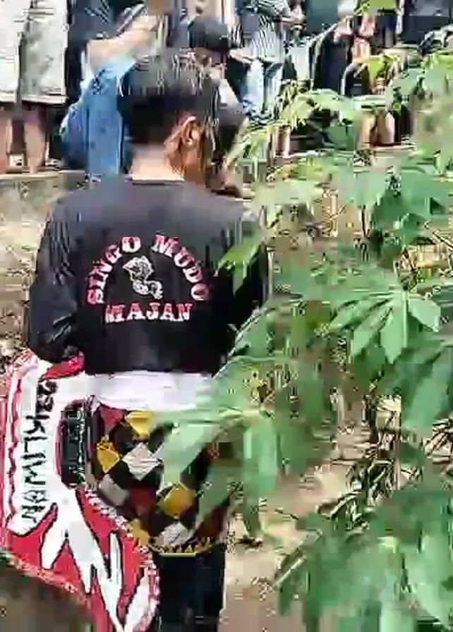 A person wearing a black long-sleeved shirt with "SINGO MUDO MAJAN" printed on the back, a checkered sarong, and a white belt is standing outside, facing away from the camera
