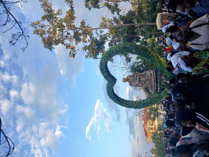 The image displays an outdoor scene in Thika Township ward, Kenya, featuring a large public gathering under a partly cloudy blue sky. The central feature is a prominent, tall, heart-shaped arch covered in green foliage, positioned slightly right of the image center. Within this arch, a dark-colored statue is mounted on a pedestal. The statue depicts a seated figure holding another figure, resembling a Pietà. To the immediate right of the heart arch, a rectangular brown monument with inscribed details is partially visible. A dense crowd of individuals, predominantly adults appearing to be of African descent, occupies the entire lower half and mid-ground of the frame. They are standing, facing generally towards the heart-shaped arch and statue. Attire varies from casual to semi-formal; several women are observed wearing white head coverings. No specific actions or interactions beyond general observation within the crowd are discernible. In the background, tall green trees with full foliage are visible on the right, and a multi-story building with a light-colored exterior and a reddish roof is present in the mid-ground on the left. The scene is illuminated by natural daylight.