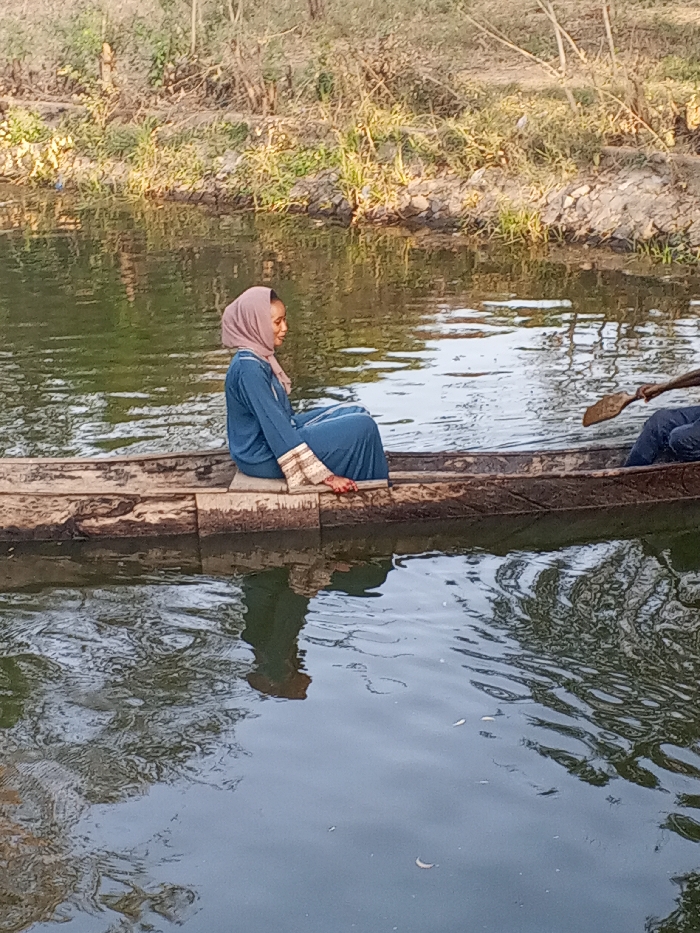 A woman wearing a headscarf and blue dress sits in a wooden canoe, facing left. The canoe floats on a body of water, reflecting the woman and surrounding vegetation. A second person, partially visible on the right, holds an oar. Trees and shrubs line the bank in the background. The lighting suggests it is daytime.