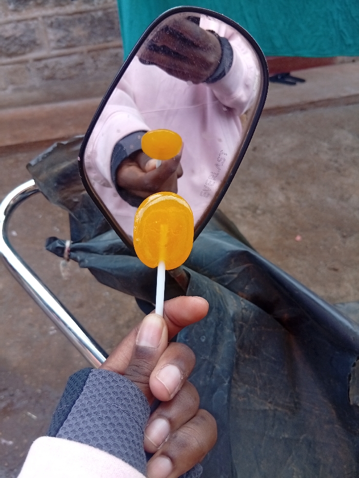 - "The image presents a close-up, eye-level view of a hand holding an orange-yellow lollipop in front of a rectangular side-view mirror" by FM-lAXhb2, licensed under CC BY 4.0