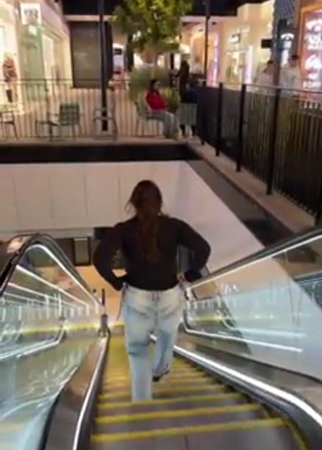 A person in a black top and light-wash jeans descends an escalator at night in an outdoor shopping mall. The person walks down a few steps, then sits and slides down the escalator. The camera is positioned at the top of the escalator, showing an outdoor mall setting with shops and people visible in the background.