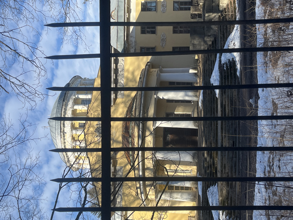 The image displays the Shuvalov Palace, located within Shuvalov Park in Pargolovo, Russia, viewed from behind a black metal fence featuring vertical bars topped with spear-point finials. The large, classical-style building exhibits a weathered, yellowish-cream facade. Its central section is dominated by a grey, fluted dome crowned with a small cross, encircled by a white columnar structure. Below this, a semi-circular portico with several white, unadorned columns frames a dark, recessed double doorway, beneath a smaller, possibly copper-domed canopy that appears oxidized. To the right, a multi-story wing of the palace features rectangular windows and decorative architectural friezes between levels. A broad, multi-step stone staircase leads up to the main entrance, showing signs of wear. The immediate foreground consists of bare earth with patches of melting snow and sparse, dormant vegetation. Bare tree branches are visible against a bright blue sky with scattered white clouds. No individuals or discernible activities are present in the scene.