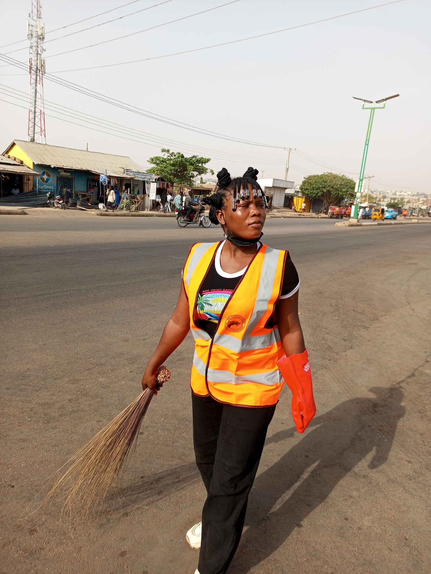 A female subject walks on an asphalt road in Gombe, Nigeria, under a bright, hazy sky. She has dark skin, braided hair with beads styled into multiple top-knots, and a black face mask resting below her chin. Her attire consists of a black t-shirt with a colorful graphic, a white collar, an orange reflective safety vest with silver strips, black trousers, and white sneakers. An orange industrial glove covers her left hand, and her right hand holds a natural fiber broom. A distinct, elongated shadow extends to her right on the pavement. The background to the left features a row of single-story commercial structures, including a building with a yellow roof and another light blue building displaying a "StarTimes Digital TV" logo. A sign for "LIFE CAMP MEDICAL" is visible on a subsequent structure. Individuals and parked motorcycles are present near these establishments. A tall, red and white lattice-style cellular tower rises against the sky on the far left, accompanied by overhead utility lines. To the right, the road continues, populated by multiple tricycles (keke napep) in various colors and a green street light pole topped with solar panels. Distant urban architecture and a hazy horizon are visible further back.