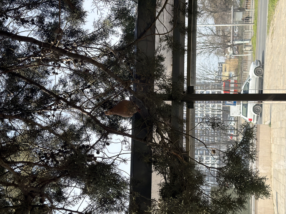 The image depicts an urban outdoor scene in Burgas, Bulgaria, observed through a glass barrier, possibly from within a building or under a large canopy. In the immediate foreground, dense branches of a coniferous tree, likely a cypress or juniper, with numerous small, dark cones, partially obscure the view. A brown Eurasian collared dove (Streptopelia decaocto) is perched on one of these branches in the upper-middle of the frame, facing slightly left. Its plumage exhibits light-colored speckling on the chest and neck. Above and behind the tree branches, a metallic horizontal support structure is visible. Through a large, clear glass panel, a street scene unfolds under a bright, clear blue sky. A multi-lane asphalt road occupies the mid-ground, featuring a white Volkswagen Passat B5 generation station wagon driving or parked on the right side, oriented towards the right. Further down the road, a distinctive red double-decker bus is partially visible, indicating the location is within Burgas. On the right sidewalk across the street, a bus stop shelter with a bench is present, with one discernible individual standing nearby. Beyond the road, bare deciduous trees line the far side of the street, suggesting winter or early spring. In the distant background, several multi-story urban buildings, including one on the far left with a grid-patterned facade, complete the cityscape. The immediate foreground features a light-colored paved surface, consistent with a sidewalk or pedestrian area. The scene is located along a major urban boulevard in Burgas, Bulgaria, such as Bulgaria Boulevard or Stefan Stambolov Boulevard, given the presence of the characteristic red double-decker public transport bus and the architectural style of the surrounding multi-story residential or commercial buildings. The specific vantage point appears to be looking out onto the street from an elevated or sheltered position.