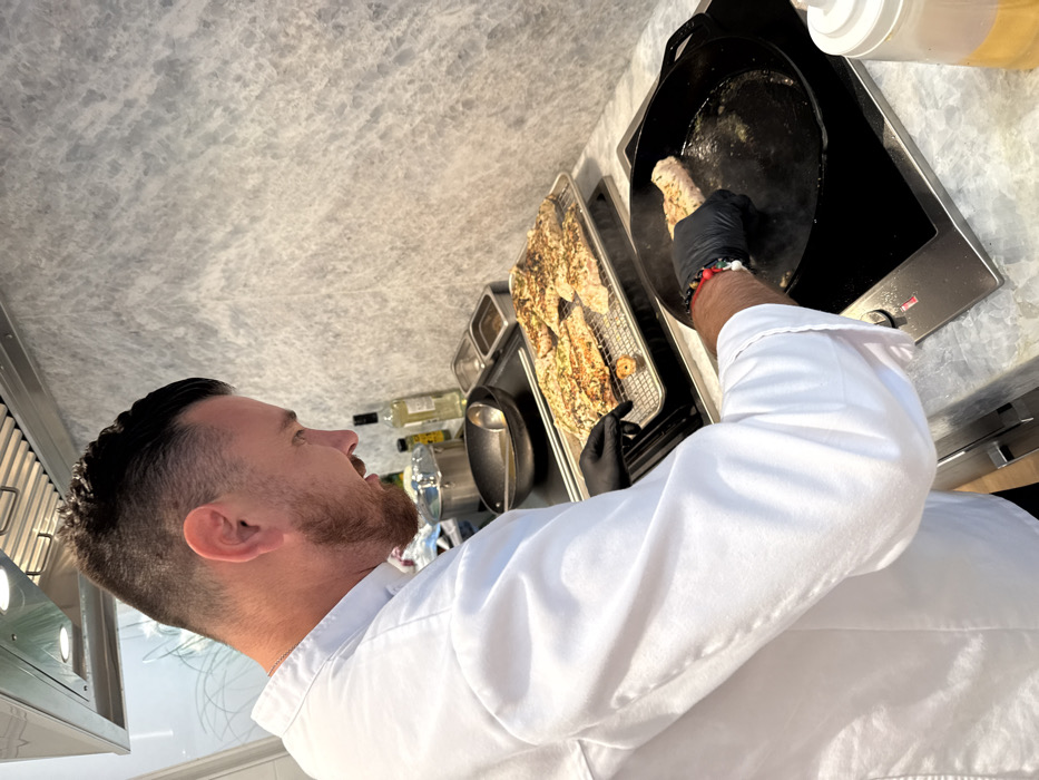 A male chef, wearing a white chef's jacket and black gloves, is actively cooking in a modern kitchen, presumably located in the city of Naples, United States of America
