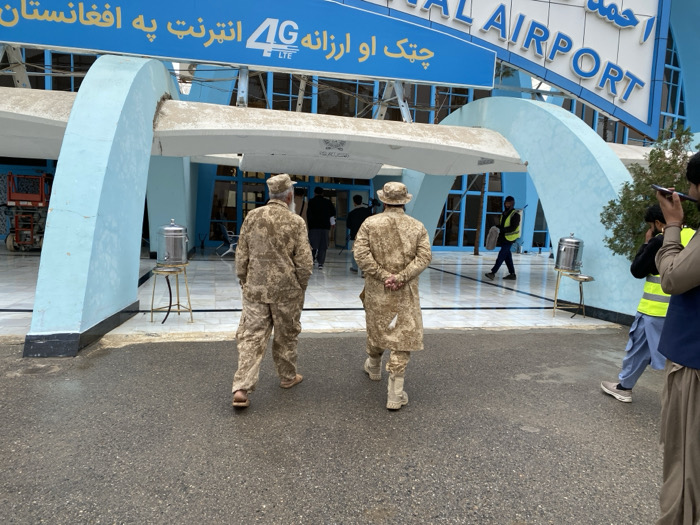 The image depicts the exterior entrance of an airport in Unknown, Afghanistan