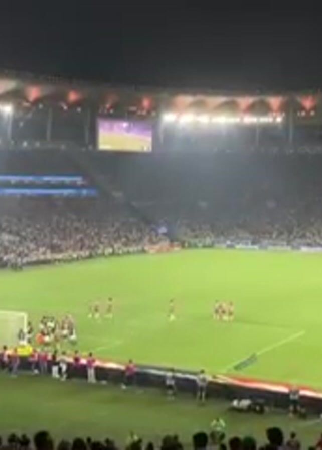soccer match at night in a large, crowded stadium. The field is well-lit, and two teams are visible near one of the goals. The stadium is packed with spectators. Smoke or haze drifts in the air, possibly from flares or pyrotechnics. There are large screens at the stadium which show the game too.