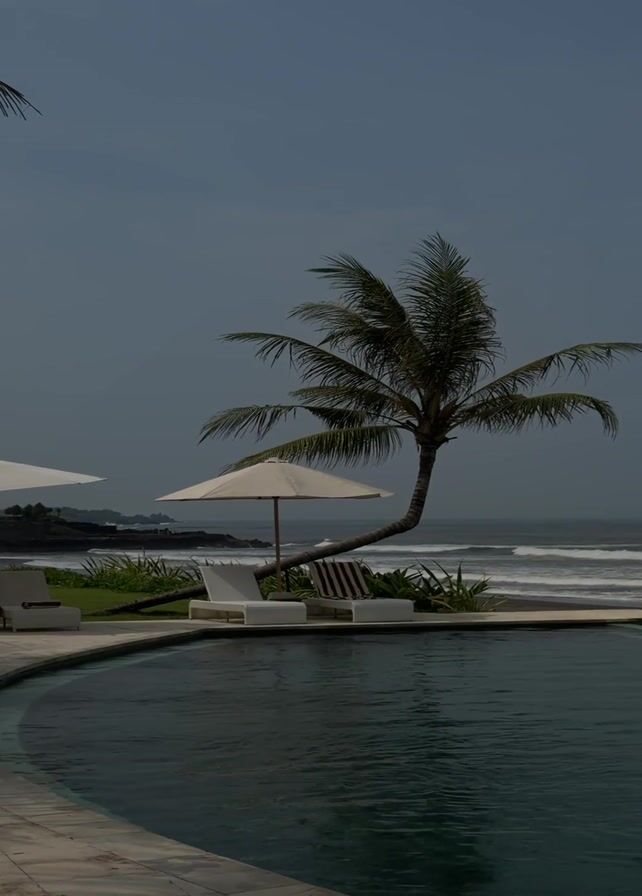 luxury resort scene featuring a curved pool and beach view. There are two white umbrellas and lounge chairs positioned around the pool, with a palm tree in the middle. The ocean is visible in the background, with waves crashing on the shore. The sky is overcast.