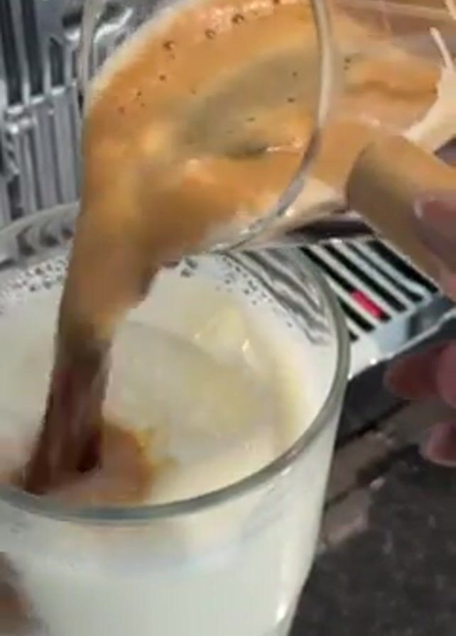 someone pouring coffee into a glass of iced milk