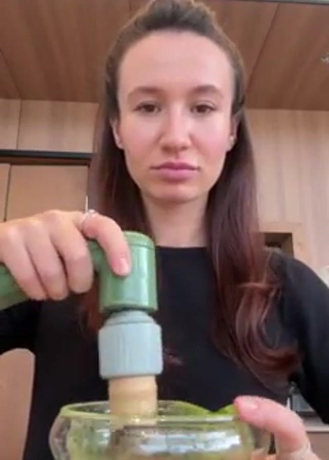 A woman with long brown hair in a half-up bun is centered in the frame, directly facing the camera. She is wearing a black long-sleeved shirt and multiple rings on her fingers. In her hands, she holds a green and gray electric whisk over a clear glass bowl filled with a green liquid. The whisk is actively mixing the contents of the bowl, creating visible bubbles. The background features light brown wooden cabinets. The lighting is bright and appears to be natural.