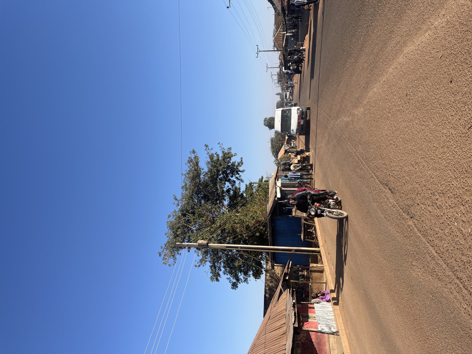 A sunlit street scene unfolds under a clear blue sky. A motorcycle with two riders is visible on the right side of the road. Shops and vendors line the street, creating a bustling atmosphere. A white van proceeds down the road in the distance. Electrical wires are strung along the left side. The road is paved with a reddish-brown surface. A leafy tree stands near a utility pole.