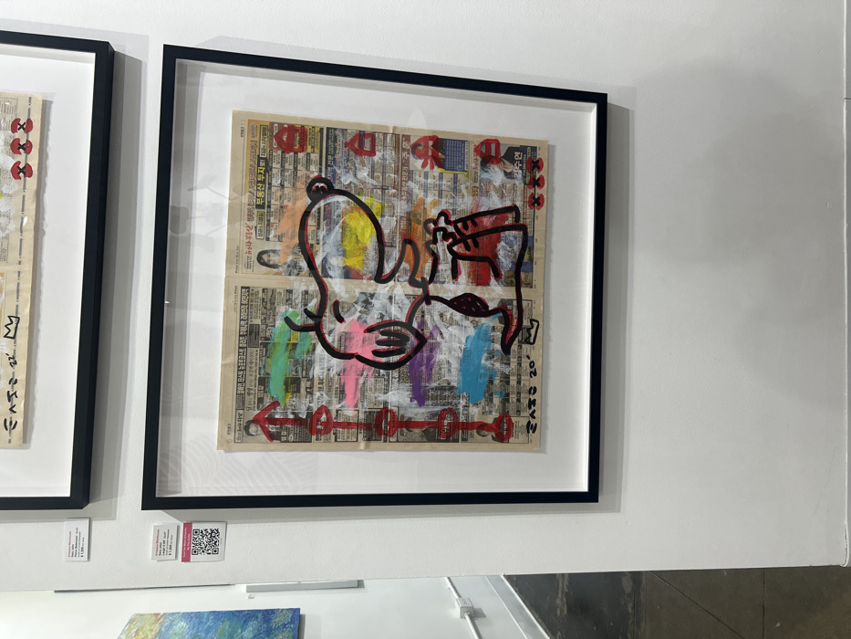 Two framed artworks hang on a white wall. The rightmost artwork features a drawing on what appears to be a newspaper background, with colorful brushstrokes and bold black outlines depicting abstract figures and symbols. Red arrow motifs run horizontally. A second framed artwork is visible to the left, showing a similar style with black lines and symbols on a newspaper. A small price tag and QR code are positioned underneath each artwork.