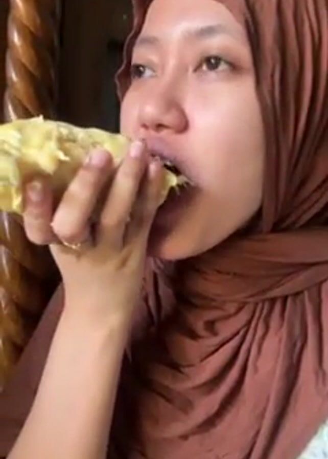 - "A woman wearing a brown hijab is eating a large chunk of durian" by FM-2HdLF2, licensed under CC BY 4.0