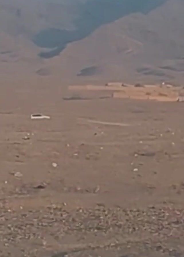 dry, mountainous landscape. Initially, a white vehicle is visible in the distance against a backdrop of hills. The scene then transitions to a wider view, revealing a barren, dusty terrain under a clear, blue sky with mountains on the horizon. The immediate foreground shows a gravelly surface, possibly a road. No people are discernible.