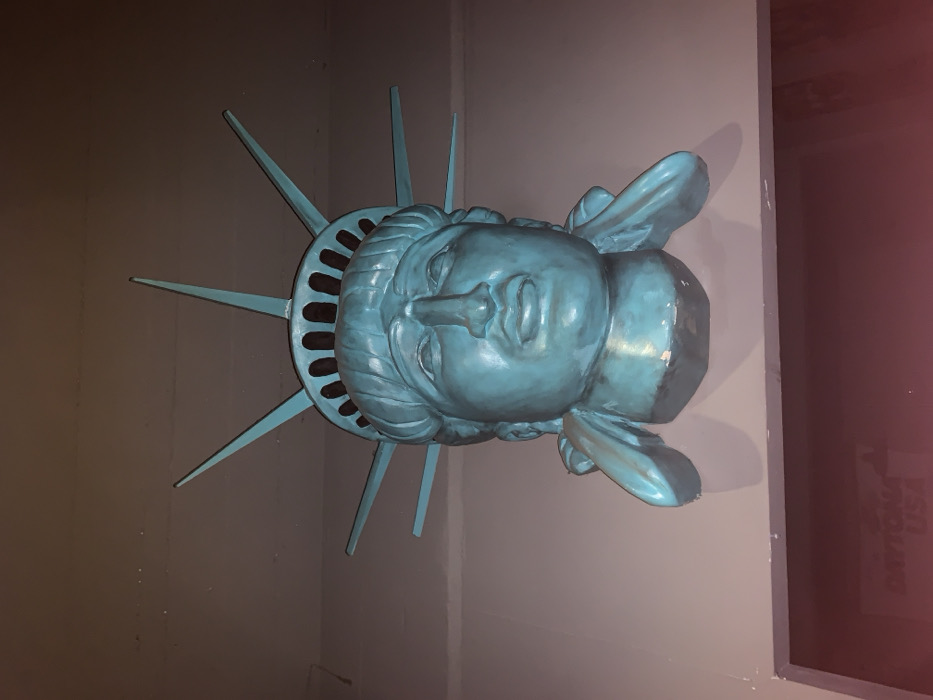 A three-dimensional replica of the head and crown of the Statue of Liberty, painted in a verdigris-like teal color, is mounted on a light gray wall