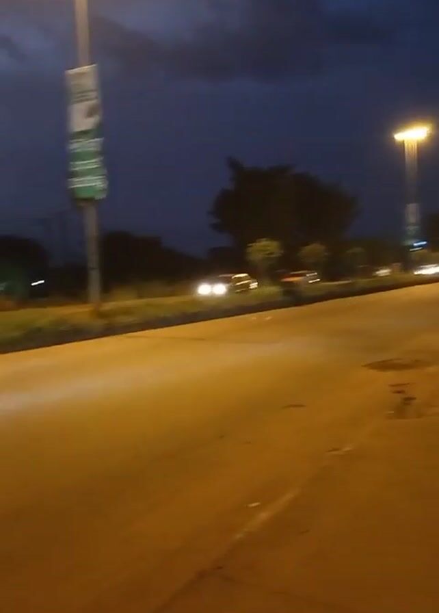 view of a street at night. The road is illuminated by streetlights that cast an orange glow. Several cars pass by. A building with a blue illuminated billboard is visible on one side of the road. The sky is dark with some clouds.