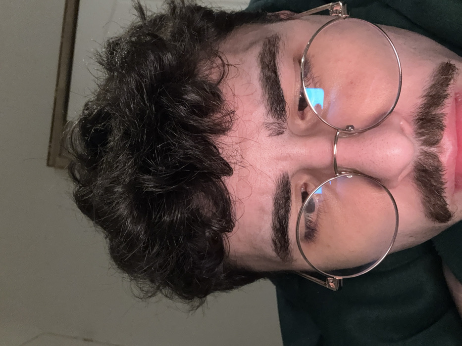 The image is a close-up of a person's face tilted. They have dark, curly hair and are wearing round eyeglasses with a silver-colored frame. Thick eyebrows are visible, and the eyes are reflecting a bright light source. The person is wearing a dark green garment, possibly a shirt or sweater. The background is blurry, with a hint of a picture frame.