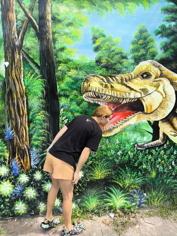 An individual is depicted interacting with a large wall mural in the city of Quảng Ngãi, Vietnam. The mural illustrates a vibrant jungle scene featuring dense green foliage, prominent brown tree trunks, and a blue sky background. A large, yellowish-brown dinosaur head, identifiable as a Tyrannosaurus Rex, occupies the right side of the mural with its mouth wide open, revealing a red interior and white teeth. The person, a young adult with light-colored hair, is wearing a black short-sleeved t-shirt with a white logo, tan shorts, and camouflage-patterned open-toed sandals. They are positioned with their back partially towards the viewer, bent forward at the waist, placing their head directly into the painted open mouth of the dinosaur. The individual's gaze is directed into the dinosaur's mouth. The immediate foreground shows a paved ground surface with scattered dirt and debris.
