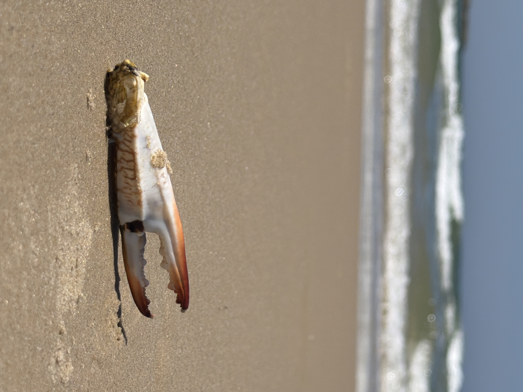 - "The image depicts a detached crab claw resting on the wet, light brown sand of a beach in Tel-Aviv, Israel" by FM-grnl23, licensed under CC BY 4.0