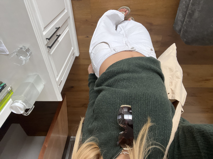 The scene depicts an individual standing indoors in Interlomas, Mexico, viewed from an overhead perspective. The subject wears a dark green, ribbed, long-sleeved cropped sweater featuring a half-zip closure, which reveals a section of the abdomen. Dark-framed sunglasses are hooked onto the sweater's neckline. Light-colored, wide-leg pants with visible seam details are worn, complemented by light-colored flip-flops. A beige canvas tote bag is carried over the subject's left shoulder. The immediate environment includes a floor constructed of light-to-medium brown wooden planks. In the lower-left foreground, a dark gray, upholstered object is partially visible. To the right, a white, paneled cabinet or bedside table with two black-handled drawers is present. Positioned on the table's surface are a clear, ribbed plastic water pitcher with a white lid, containing liquid, and a clear glass tumbler also containing liquid. The spines of several books are partially visible behind these items. A medium-brown wooden door or wall panel is visible in the background on the right. The individual appears to be standing still; no specific actions or interactions are depicted.