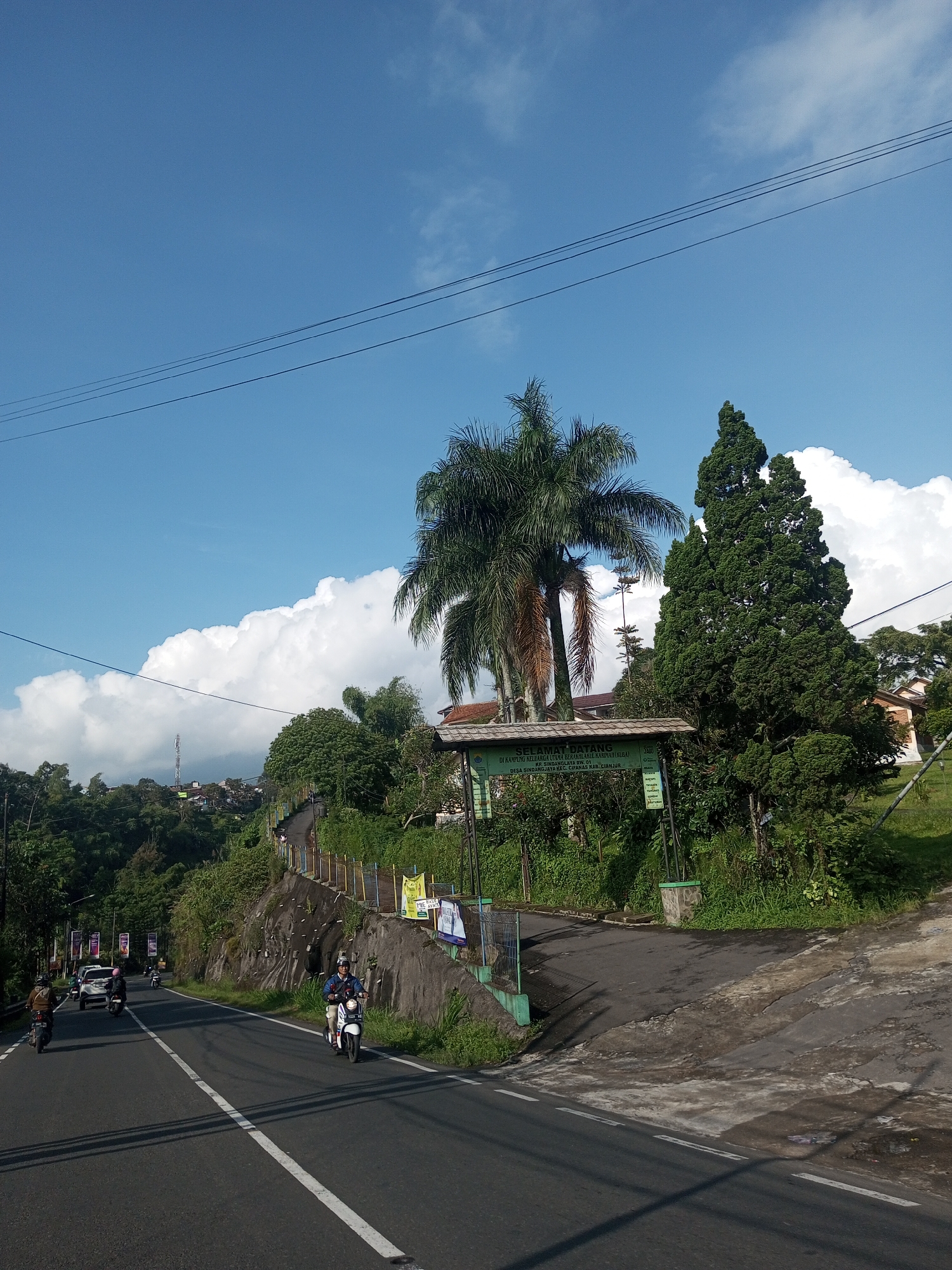 The image depicts a road scene under a blue sky with scattered clouds. The road curves slightly uphill. In the foreground, motorcycles are visible on the road. To the right of the road is a green gateway structure with a sign in Indonesian that reads "SELAMAT DATANG DI KAMPUNG KELLARGA UTAMA BERAKHLAKUL KARIMAH" (Welcome to the main family village with noble character). Behind the gateway, lush greenery and trees are prominent, including a palm tree and a tall evergreen tree. A wall runs along the right side of the road, adjacent to the greenery. In the distance, rooftops of buildings are visible amongst the trees. Electrical wires stretch across the upper portion of the image. The image's exact location in Nhot Chang, Laos, is not discernible from the given image.