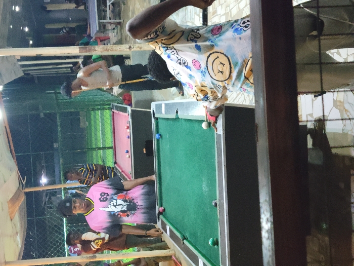 Several individuals are in a recreational space. One person stands at a pool table with a green felt surface, while a second pool table with a pink surface is visible in the background. A third person is positioned as if playing pool with a cue in hand. One person is in the immediate foreground wearing a patterned shirt with smiley face designs. A fence with green vines can be seen in the background, and there are hanging lights.