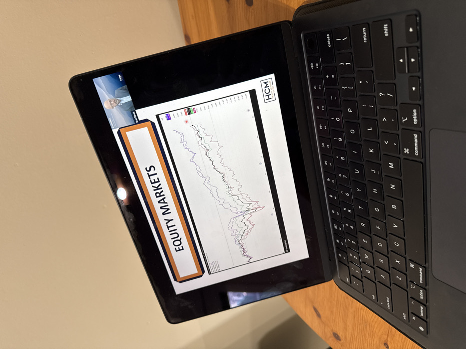 An Apple iPad Pro, housed within a black Apple Magic Keyboard, is positioned at an angle on a light brown wooden surface, likely a table. The iPad's screen displays a presentation slide. The central element of the slide is a large title "EQUITY MARKETS" in black text within an orange-bordered rectangle. Below this, a detailed multi-line graph, indicative of financial market data, occupies the majority of the screen, featuring lines in various colors against a white background with numerical scales on the right axis. In the upper right corner of the screen, a small rectangular video conference window shows a bald, bespectacled male identified as "Dan Brock" wearing a light blue collared shirt and a dark jacket. A "HCM" logo is visible in this window and also at the bottom right of the main slide. The background consists of a plain, light beige wall. The specific location within New York City cannot be determined from the provided image.