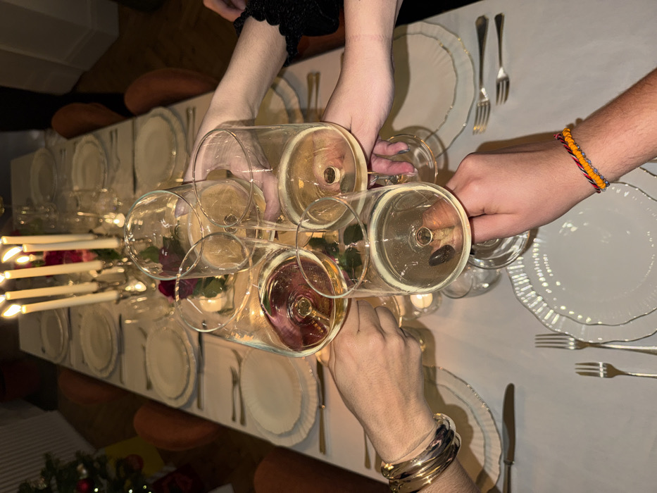 - "A close-up overhead shot shows a celebratory table setting with champagne flutes being clinked together" by FM-OZmdD3, licensed under CC BY 4.0