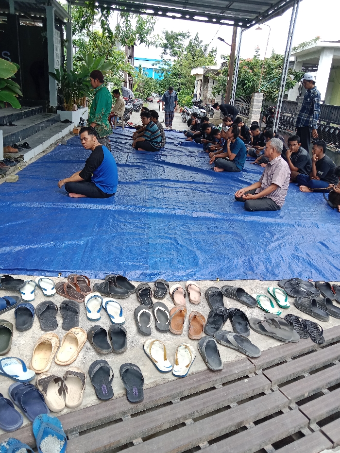 A group of men are seated on a blue tarp in an outdoor setting, likely for prayer or a religious gathering. They are arranged in rows, some with crossed legs and others with hands in a prayerful position. In the foreground, numerous pairs of sandals are neatly organized on a wooden platform. Several men are standing. Greenery and buildings can be seen in the background.