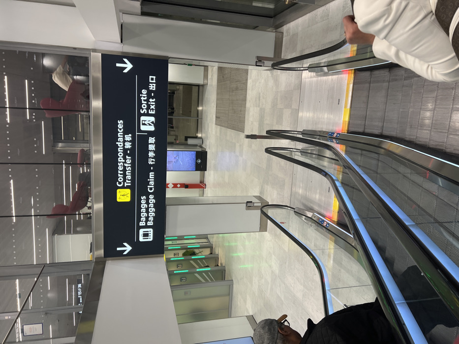 At an airport, a black sign directs passengers to "Correspondances/Transfer", baggage claim, and the exit. Arrows point in opposite directions. The sign features multilingual text, including Chinese. In the background, there are transparent windows displaying chairs and a gray tiled floor. An escalator is visible, and people are riding it. There are also automated security gates behind the sign.