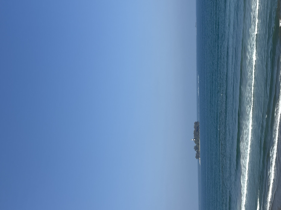 The image presents a wide view of the Gulf of Mexico coastline in Veracruz, Mexico, specifically featuring Isla de Sacrificios. The scene is dominated by a clear, bright blue sky, occupying the upper two-thirds of the frame. A distinct, level horizon separates the sky from the ocean. The lower portion of the image shows dark blue-green ocean water. In the immediate foreground, multiple parallel lines of white-capped waves are visible, indicating proximity to a shoreline. In the mid-distance, slightly to the left of the central axis, lies a small, low-lying island identified as Isla de Sacrificios. This island is densely covered with dark green foliage. A prominent, slender lighthouse, striped horizontally in black and white, stands centrally on the island amidst the trees. To the right of the island, faint white streaks on the water suggest the wakes of small, fast-moving watercraft, although the vessels themselves are indistinct. No individuals are visible in the scene. The lighting is uniform and bright, consistent with clear daylight conditions.