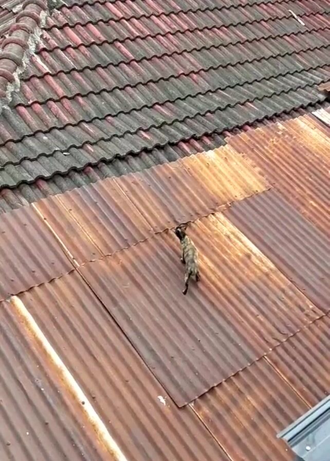 The camera shows a roof of a house, with an overlapping section that appears to be made of corrugated metal. A cat of tan, black, and grey coloring, is walking across the corrugated metal roof section away from the camera. The cat is then heard meowing as it turns around to face the camera. The cat then continues to walk away.