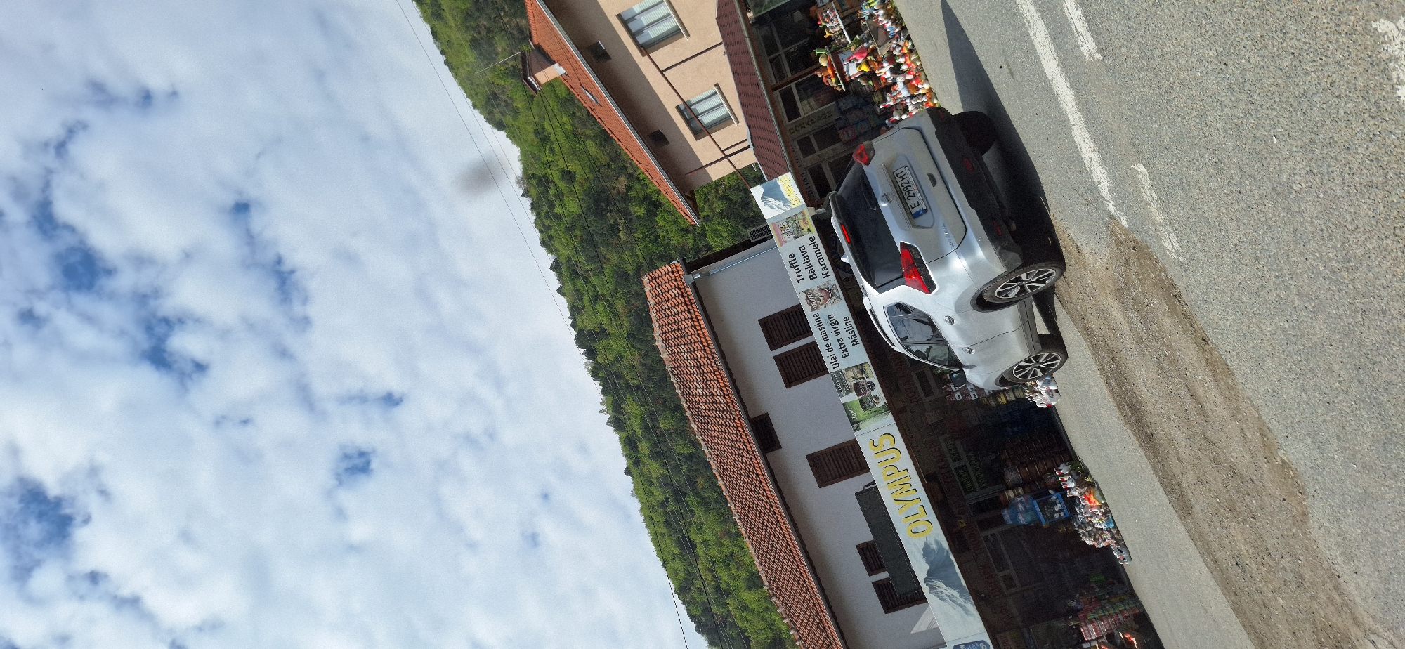 silver Nissan Qashqai, registration number E 292 HT, parked on a road in Kresna, Bulgaria, next to the "OLYMPUS" store, which sells local products such as olive oil, truffles, baklava, and caramels. A building with a red-tiled roof stands adjacent to the store, and beyond that, there is dense green foliage. In the background is a light-colored building, possibly residential. The sky is partially visible with scattered clouds. Pedestrians are present outside the store. The road appears to be paved.