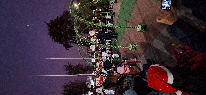 A band performs outdoors, framed by decorative arches covered in greenery. People sit and stand watching the performance; some are wearing Santa hats. One person is using a smartphone to record. The band is set up on a raised area with green turf, bordered by a brick path. In the background, the sky is dusky, and a few lights streak across it. Trees are silhouetted against the twilight.