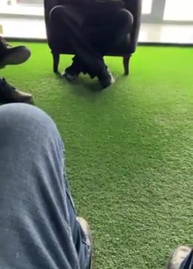 n indoor scene with artificial green turf on the floor. A person wearing jeans sits in the foreground with their knees visible. In the mid-ground, another person wearing dark trousers and a camouflage jacket sits in a dark-colored armchair. The person in the armchair is turned towards the seated person in the foreground, although their face is not fully visible. Another person is partially visible to the left of the person in jeans, wearing dark shoes. The background consists of a large window with an exterior view of cars and a building. The scene appears to be a casual meeting or discussion.