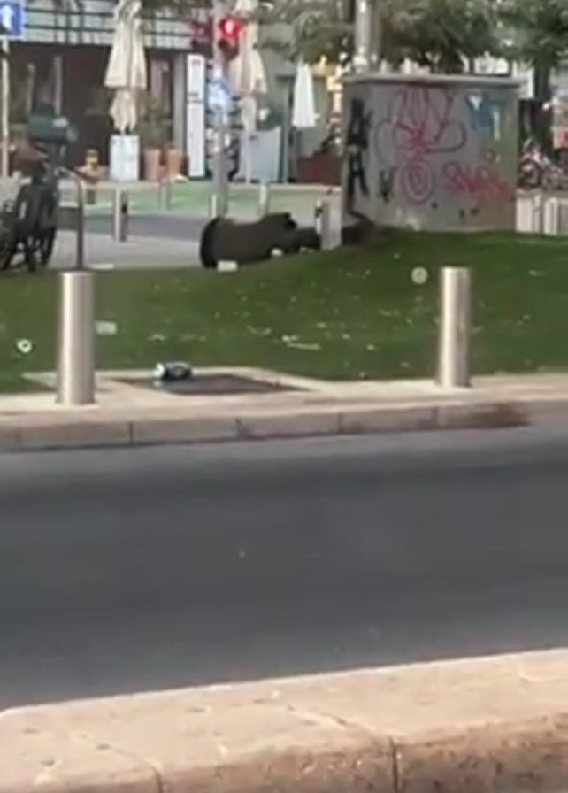grassy area in what appears to be an urban setting. A dark-colored object, possibly a large dog or animal, is lying down on the grass. There are metal bollards surrounding the grassy area. A road is visible in the foreground, with a curb separating it from the grassy area. In the background, there are buildings, trees, a utility box with graffiti, and other street furniture. The traffic light is red. The overall scene appears calm.