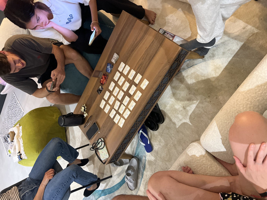 The image depicts an indoor gathering of at least five individuals in Modio, Greece. A rectangular dark wood coffee table, featuring a patterned design along its sides, occupies the central foreground. Approximately 25-30 light-colored game cards are arranged face-up in rows on the table, alongside a clear plastic container holding red and black game tokens, and a separate group of blue tokens. Additional items on the table include a black cylindrical portable speaker, a black smartphone, a pair of eyeglasses, a crumpled wrapper, and a small patterned pouch. At the upper-center, a male, wearing a dark gray t-shirt and shorts, is seated on a teal cushion, smiling and looking at a black smartphone he holds. To his right, a female in a white t-shirt with a blue graphic and dark pants is also seated on a teal cushion, intently looking at a white smartphone, with her left hand supporting her chin. Her bare feet are visible on the rug. On the far left, partially visible, a female in blue jeans and black flat shoes is seated on a black folding chair. In the lower-left foreground, a female with bare legs is partially visible, seated on a cream-colored textured sofa. In the lower-right foreground, a leg wearing a gray sock and light-colored pants is visible. The floor is covered by a light-colored, textured rug. A pair of gray sandals, a pair of blue flip-flops, and a pair of black slip-on shoes are placed on the rug around the table. In the background, a lime green beanbag topped with a white blanket is visible, along with a white geometric-patterned rug on a light gray floor.