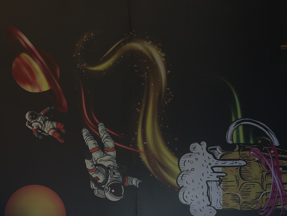 The image displays a vibrant, stylized mural on a dark wall, likely located within a commercial establishment such as a bar or restaurant in San Andrés Cholula, Mexico. The exact address or specific venue in San Andrés Cholula cannot be determined from the visual content. The mural's central theme combines outer space elements with a large beer mug. The background is predominantly black, simulating deep space. In the upper portion, two cartoon-style astronauts are depicted floating: one smaller, positioned in the upper right, and another larger, horizontally oriented in the mid-left. Both astronauts wear white suits with orange accents. A yellow-orange circular planet is visible in the upper left, and a red and yellow ringed planet (Saturn-like) is in the upper right. Below the larger astronaut, a dynamic arrangement of swirling red and yellow light trails, interspersed with white speckles resembling cosmic dust or stars, extends downwards. These trails appear to emanate from the astronaut's position, creating a visual flow towards the lower-left. The lower-left quadrant features a prominent, oversized beer mug. The mug has a textured, golden-brown body, suggesting wood or heavy glass, and is filled with a golden liquid. A massive, frothy white head of beer foam overflows the top, with visible drips cascading down the mug's exterior. Stylized pink-red light trails or bands encircle the base of the mug. The overall composition creates an energetic and fantastical scene, merging cosmic exploration with the enjoyment of beer.