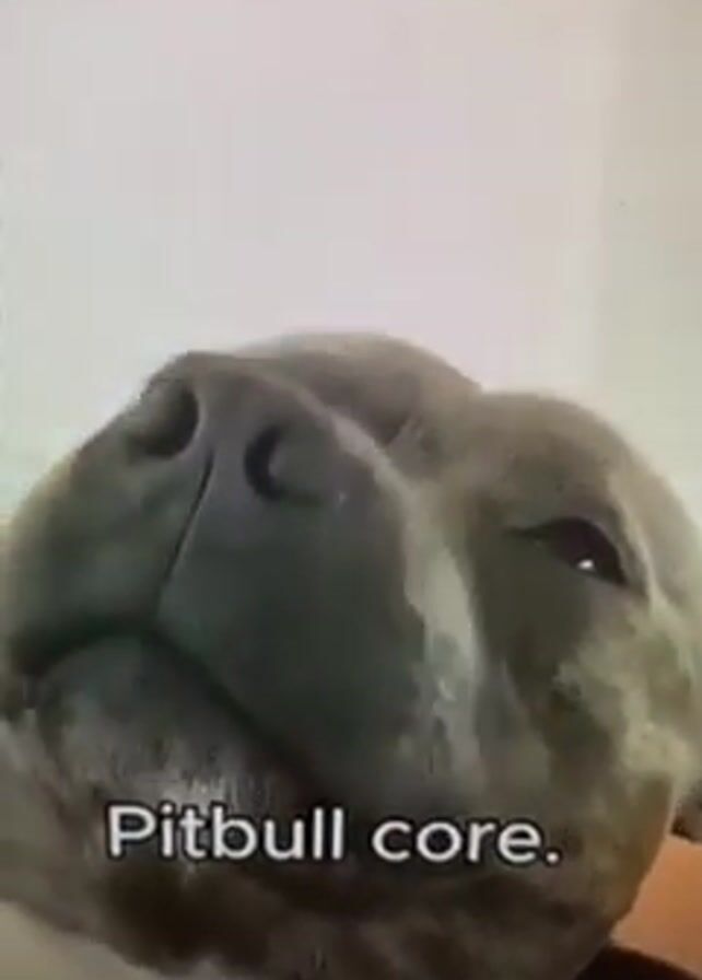 close-up of a pitbull's face. The dog is lying down with its eyes closed, and its tongue is slightly sticking out. The text "Pitbull core" is overlaid on the video. The background is a plain white wall. The dog appears relaxed and content.