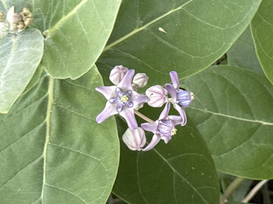 - "The image displays a close-up view of a cluster of Calotropis gigantea (Crown Flower) blossoms and buds amidst broad green leaves" by FM-Oi8nu1, licensed under CC BY 4.0