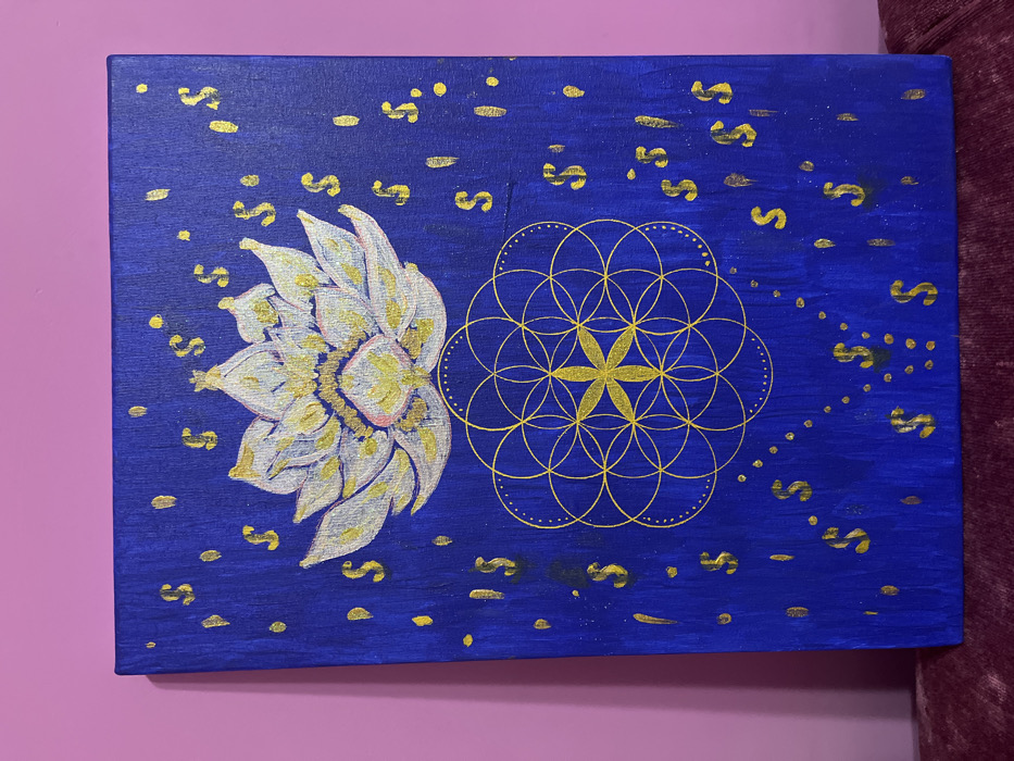 A rectangular canvas features a painted design. Dominated by a blue background, it showcases a prominent white and gold lotus flower on the left and a gold geometric mandala-like pattern, seemingly a 'flower of life,' on the right. Scattered across the blue surface are numerous small, gold, cursive 'S' shapes, lending a playful, whimsical aesthetic to the artwork.