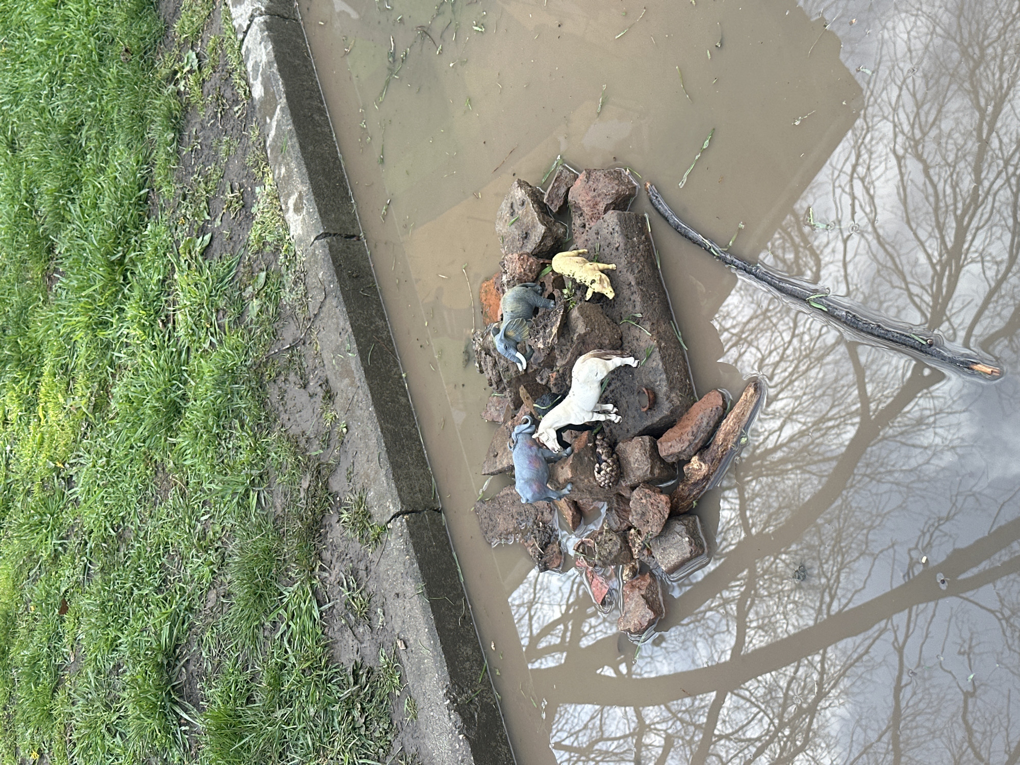 The image depicts a puddle next to a curb, likely formed after rainfall. Within the puddle, a collection of rocks and a piece of wood are arranged, forming a small "island". Several toy animal figurines (a yellow pig, a white cow, a dark blue elephant and something else) are placed on the rocks. The water in the puddle reflects the bare branches of trees, indicating a time of year when leaves are absent. The ground adjacent to the curb is covered in green grass. The location is claimed to be in the city of Dobrich, Bulgaria.