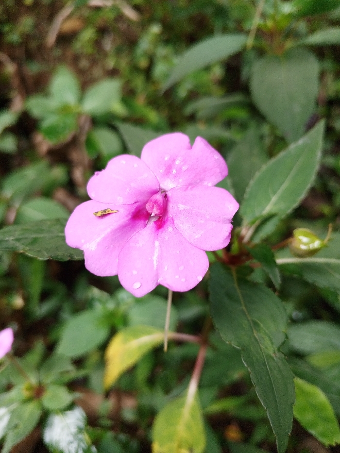 A close-up, vertical shot depicts a single bright pink flower, likely an Impatiens, covered in numerous small water droplets, indicating recent precipitation. The flower features five prominent petals with a darker pink center. Resting on the upper left petal is a small, horizontally oriented insect, yellowish-brown with dark spotting. The background consists of dense, out-of-focus green foliage, with some leaves showing slight yellowing. A small, light green bud or seed pod is visible on a stem to the right of the main flower. The scene is located in the city of Silvino Lobos, Philippines.