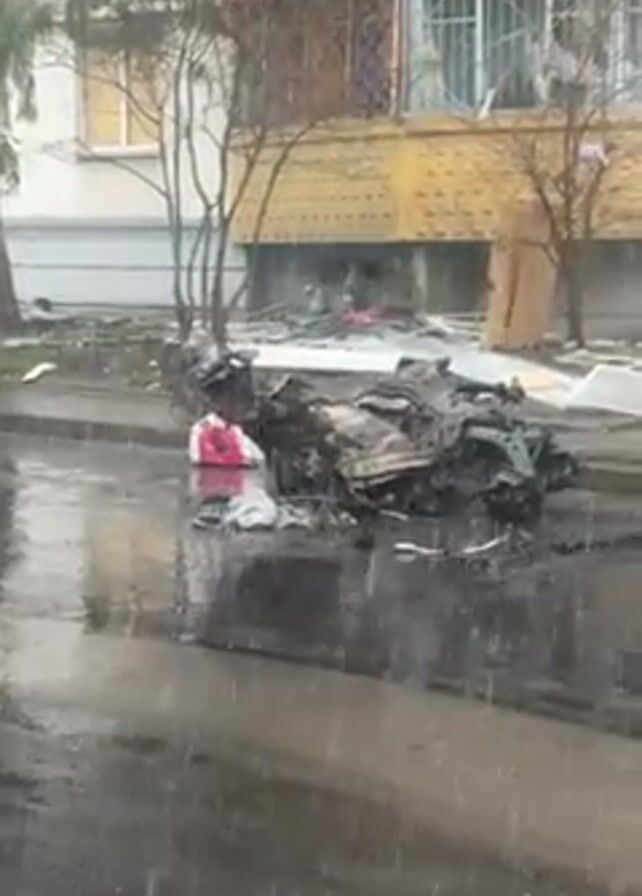 The scene shows the aftermath of an explosion in a residential area. Rain is falling heavily. In the foreground, on a wet pavement, is a pile of charred debris, apparently from a destroyed vehicle. To the right, there is plywood and other debris scattered on the ground. The facade of a yellow apartment building is visible, showing damage to the lower level, including broken windows covered with makeshift barriers. One person is visible in the building on the second floor.