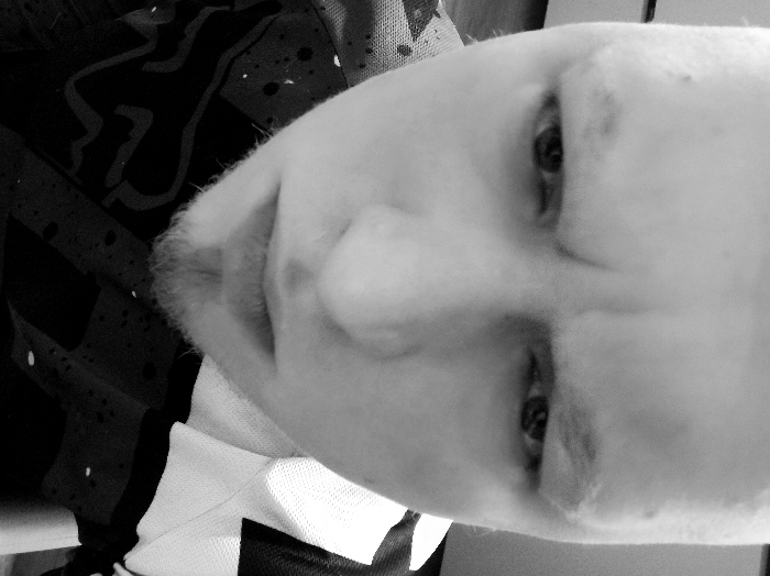 - "A close-up, black and white image depicts a man's face, positioned at an odd angle" by FM-5QedD3, licensed under CC BY 4.0