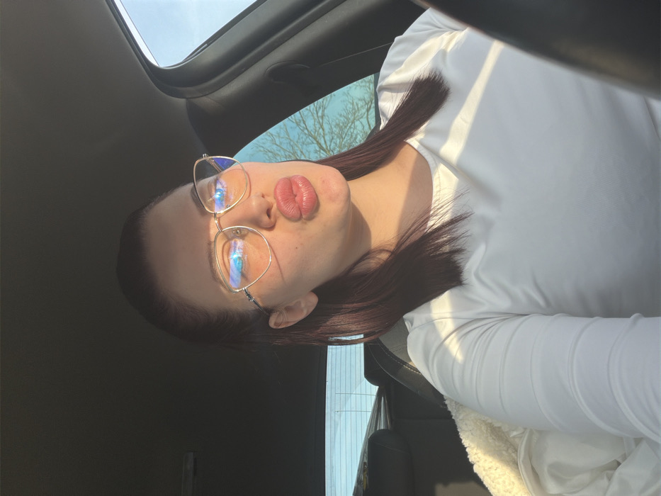 A female individual is depicted seated within a vehicle in Podslon, Bulgaria. The subject has shoulder-length, dark reddish-brown hair and wears light-rimmed eyeglasses, exhibiting distinct blue reflections on the lenses. Her lips are deliberately pursed in a 'kissing' gesture. She is attired in a white, long-sleeved top. Direct sunlight illuminates the right side of her face and upper body, casting shadows. To her left, a white, textured, possibly sherpa-lined garment is visible on the seat. The vehicle's interior is dark grey or black, with a portion of a black steering wheel visible in the lower right. Through the rear window, a light blue sky and the silhouette of leafless tree branches are discernible.