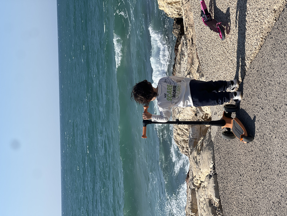 young child standing on a paved walkway overlooking the Mediterranean Sea, likely along the Tel-Aviv coastline in Israel. The child, with dark, curly hair, is viewed from behind, wearing a long-sleeved white shirt with green text reading "WE SCARE BECAUSE WE CARE!", dark blue sweatpants, and white sneakers. The child holds the orange handlebars of an upright orange and black three-wheeled kick scooter, facing the sea. To the child's right, a smaller pink and black scooter lies on its side on a gravelly or rocky patch. The immediate foreground is a dark grey, textured paved surface. Beyond this path, a rugged shoreline composed of light-colored, irregular rocks and boulders separates the land from the water. The sea exhibits a deep turquoise to blue hue with visible white-capped waves breaking against the rocks. The horizon line is flat and clear. The sky above is a bright, cloudless blue. The scene is illuminated by bright sunlight, casting distinct shadows. A faint, dark circular smudge is present in the upper center of the sky.
