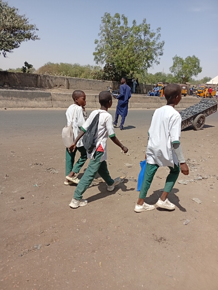 The image depicts an outdoor scene in Gwagwarwa, Nigeria, under a clear, light blue sky. In the foreground, three young males, appearing to be adolescents or children, walk from left to right on a reddish-brown dirt path scattered with small stones and debris. All three are wearing white short-sleeved shirts with green collars and cuffs, over green trousers, and light-colored athletic shoes. The leftmost boy has a light-colored bag slung over his left shoulder. The central boy carries a dark backpack over his left shoulder. The rightmost boy holds a blue object, possibly a bag or folder, in his left hand. Their shadows are cast towards the lower left. Parallel to the dirt path, a grey paved road extends horizontally across the midground. An adult male, dressed in a dark blue traditional Nigerian outfit, walks away from the camera on this paved road, heading towards a concrete barrier. He appears to be carrying a light-colored tray or flat object in his left hand. A grey concrete barrier separates the paved road from a slightly elevated area in the background. Behind this barrier, various vehicles and individuals are visible. To the right of the adult male, several yellow auto-rickshaws (Keke Napeps) are parked or moving, along with at least one blue vehicle. A two-wheeled cart, loaded with multiple black, rounded objects (possibly tires), is positioned on the dirt path in the right midground. Sparse green and dry vegetation, including several trees with full green canopies, is present in the background.